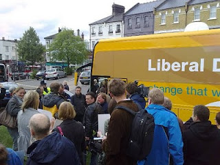 In Watford there was a large crowd, carefully managed but cheerful with a quiet, respectful media. At Blackheath there was a mass of people pushing and shoving to see Nick Clegg, excitement palpable in the air and angry Labour supporters desperately joshing to get on camera (of which there were a great amount). Foreign journalists jostled to get good positions and questioned people as to why they were voting Lib Dem. I heard a Spanish journalist whisper "We're seeing the end of bipartisan politics in Britain" to one of her colleagues. This made me smile.